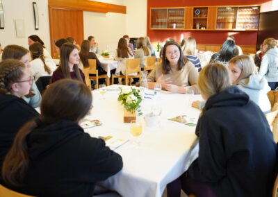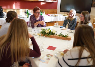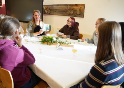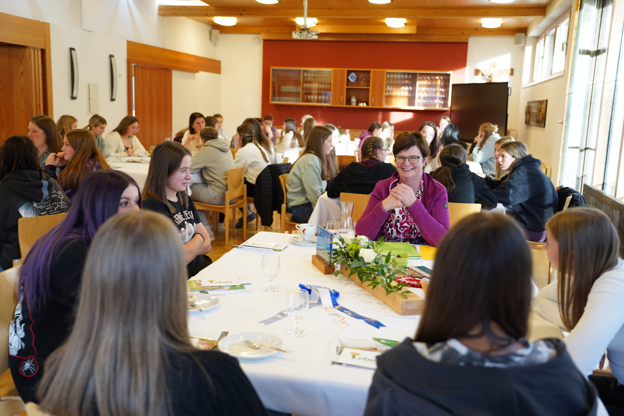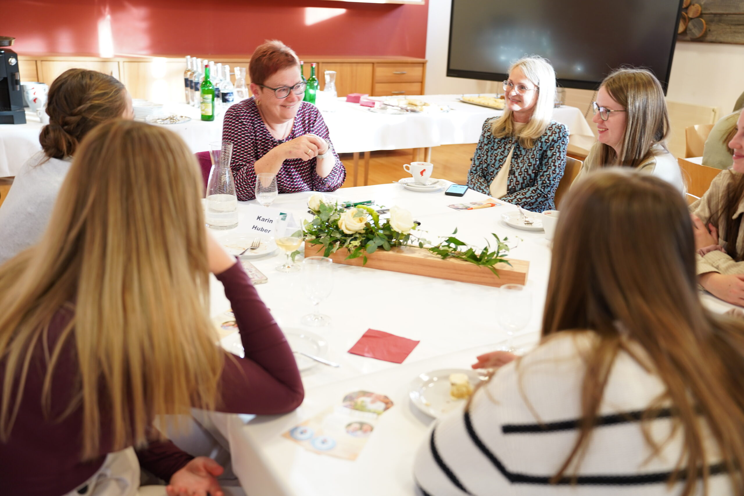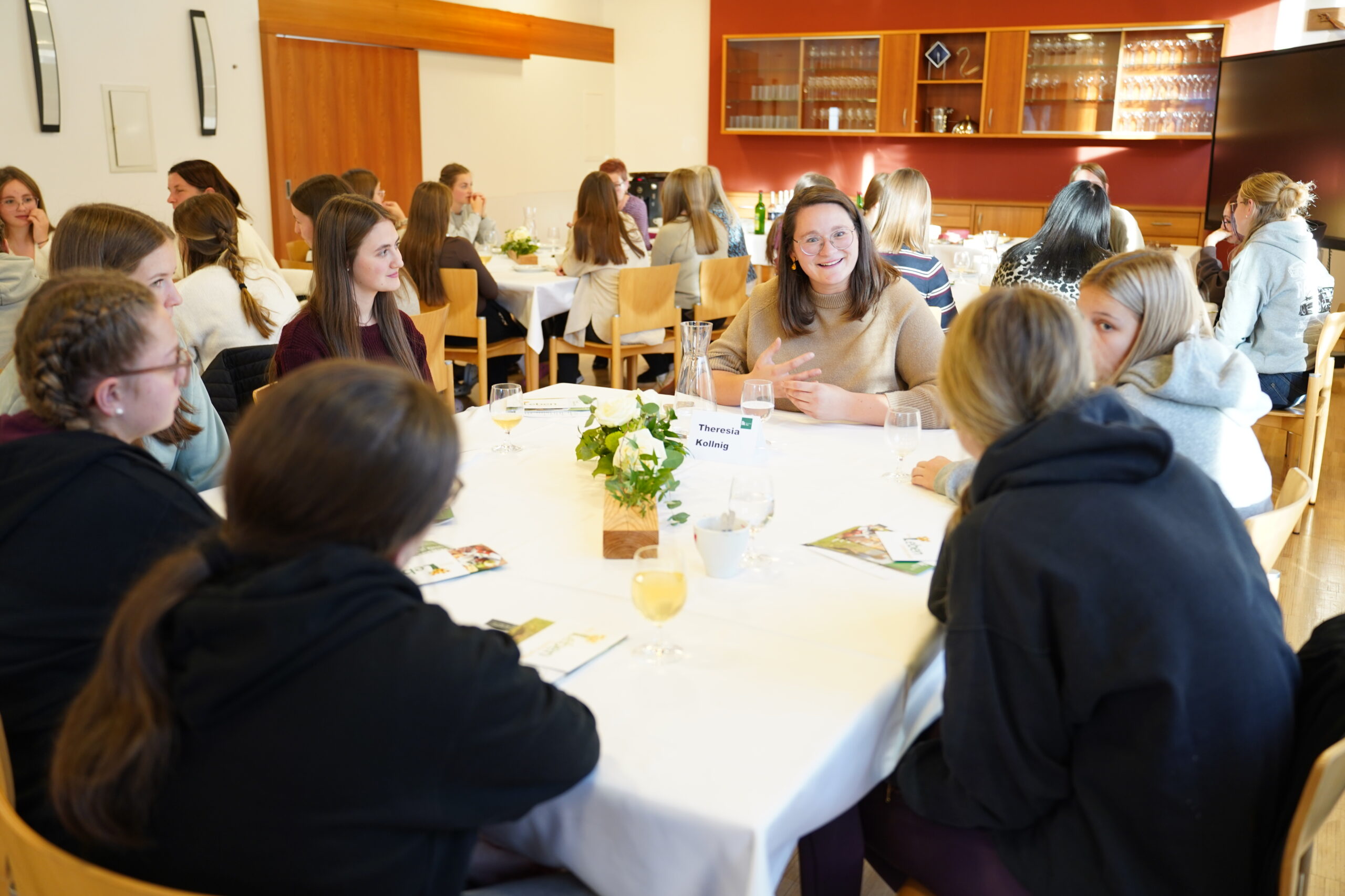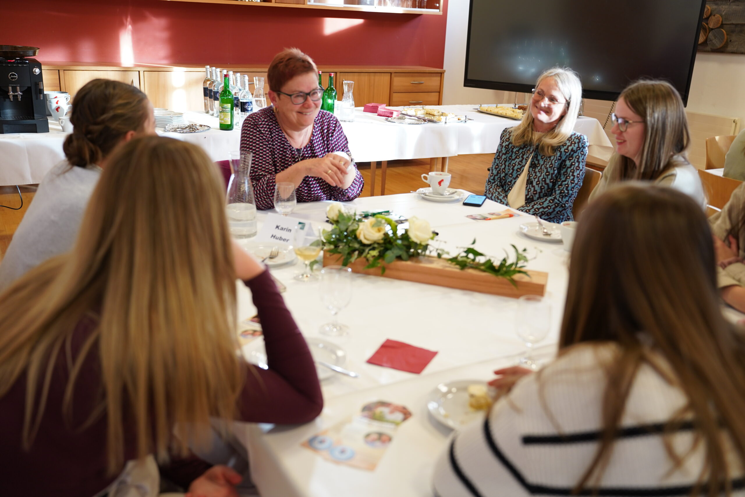 Gemeinsam mit Bezirksbäuerin Karin Huber und LK-Beraterin Natalie Kollnig organisierten AV Hannelore Frank und FL Daniela Einhauer diese kreative Gesprächsrunde in Form eines World Cafés. An sechs Tischen sitzt je eine Bäuerin, die zu bestimmten Themen erzählt und berichtet, die Schülerinnen wechseln regelmäßig den Tisch, sodass alle ins Gespräch kommen.