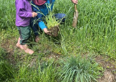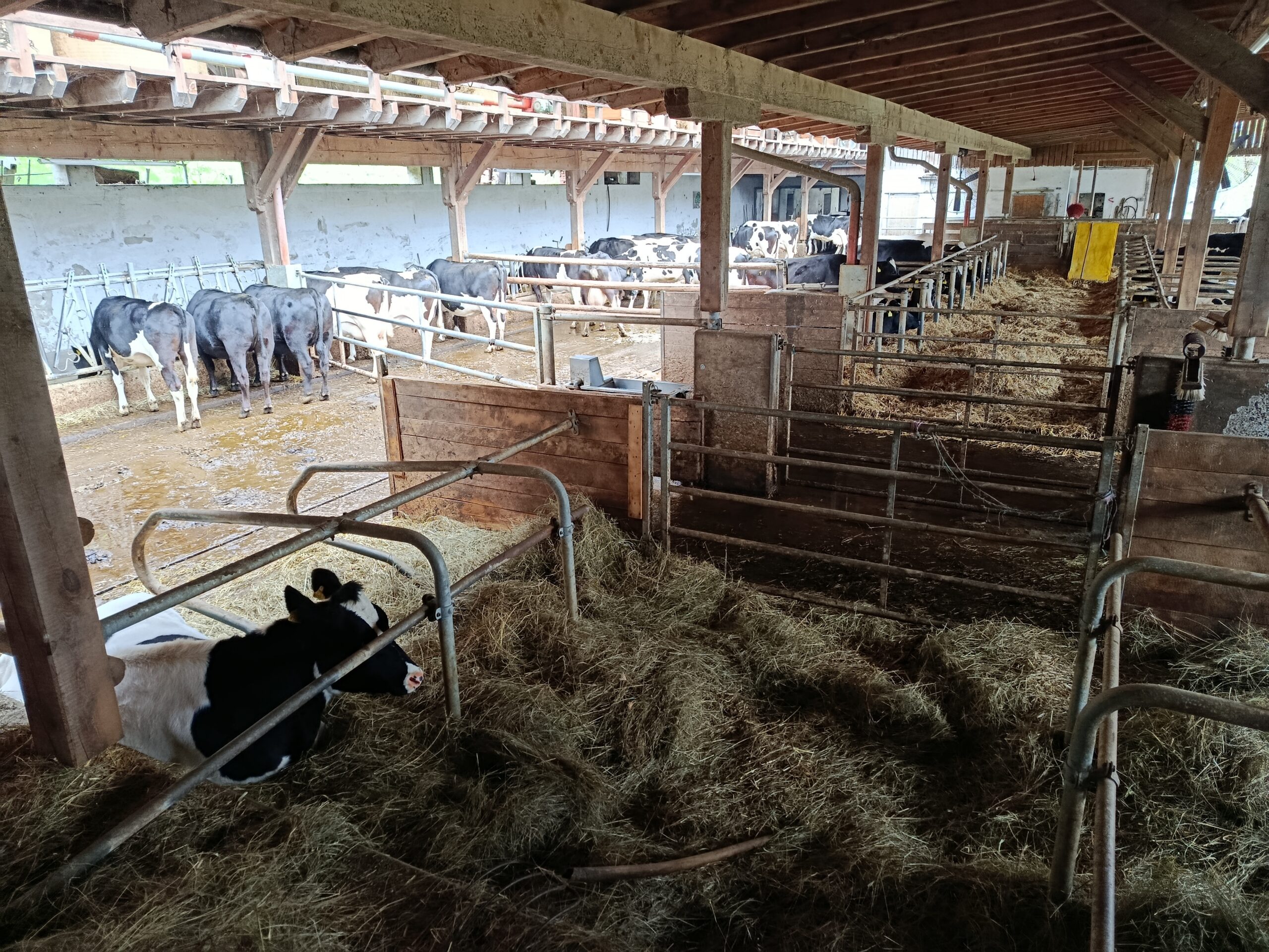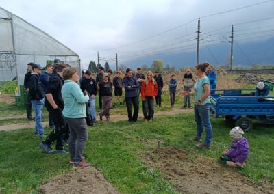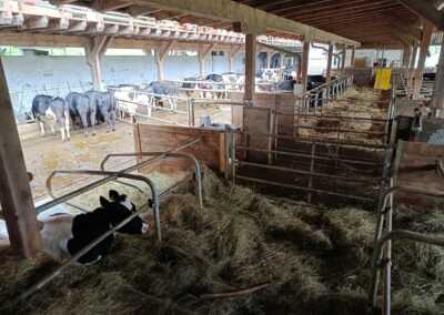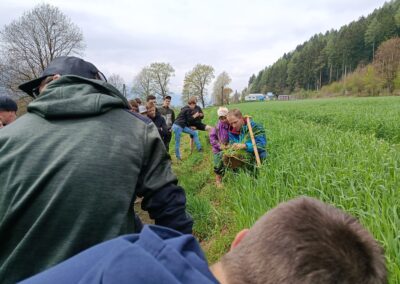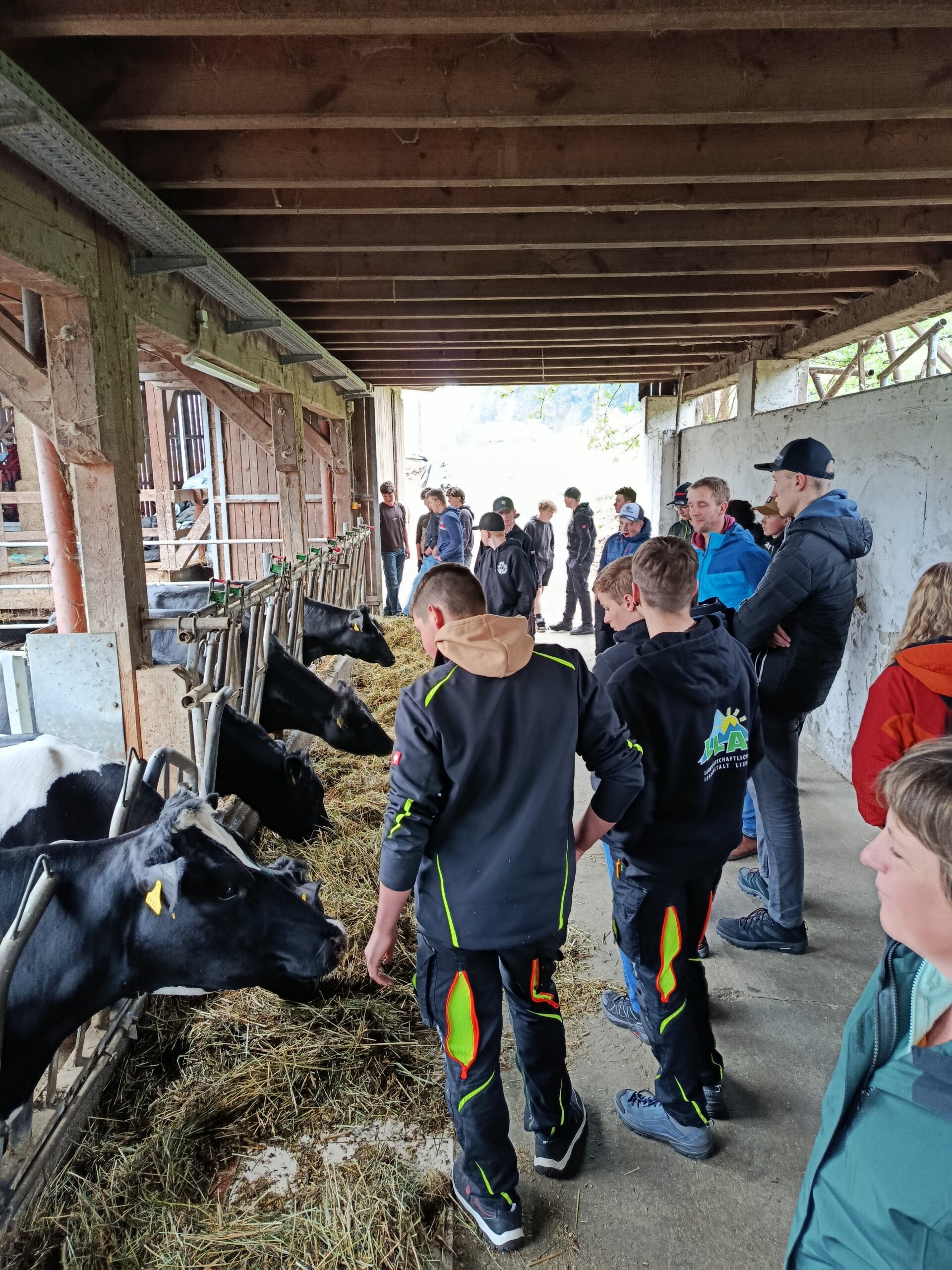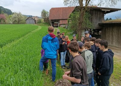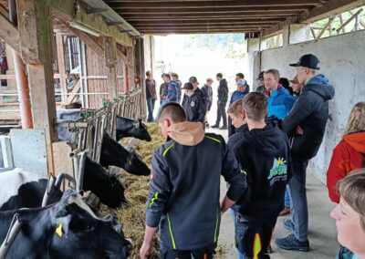 Danach besuchte die Klasse den Biohof Ertl, der rund 60 Hektar Fläche bewirtschaftet, wovon etwa 15 Hektar unter Naturschutz stehen. Am Hof werden 40 Kühe und rund 20 Kälber gehalten. Neben drei Traktoren verfügt der Betrieb auch über einen eigenen Hofladen mit eingeschränkten Öffnungszeiten. Die Schüler:innen konnten außerdem den Acker sowie ein Gewächshaus besichtigen, in dem bereits junge Pflanzen wachsen. Besonders interessant war die sogenannte Lebensleistungszucht, bei der kleinrahmige Tiere mit hoher Grundfutterleistung gezüchtet werden.