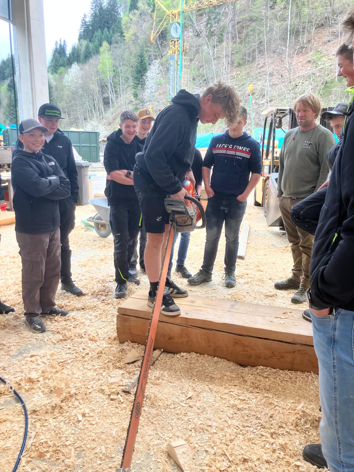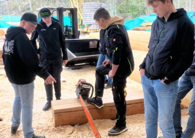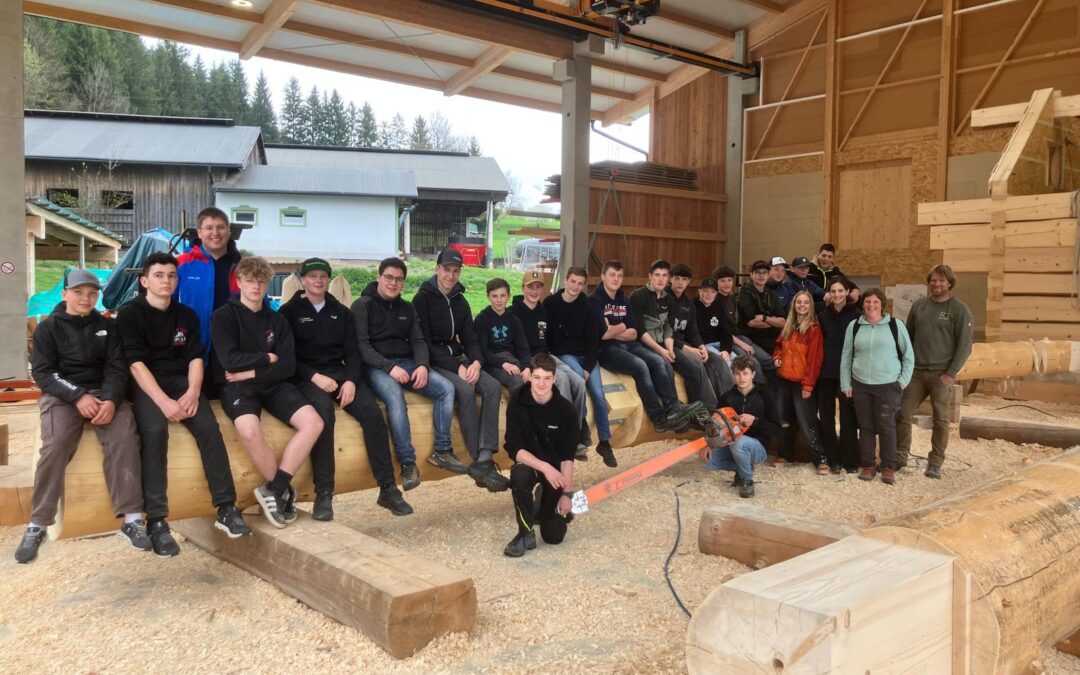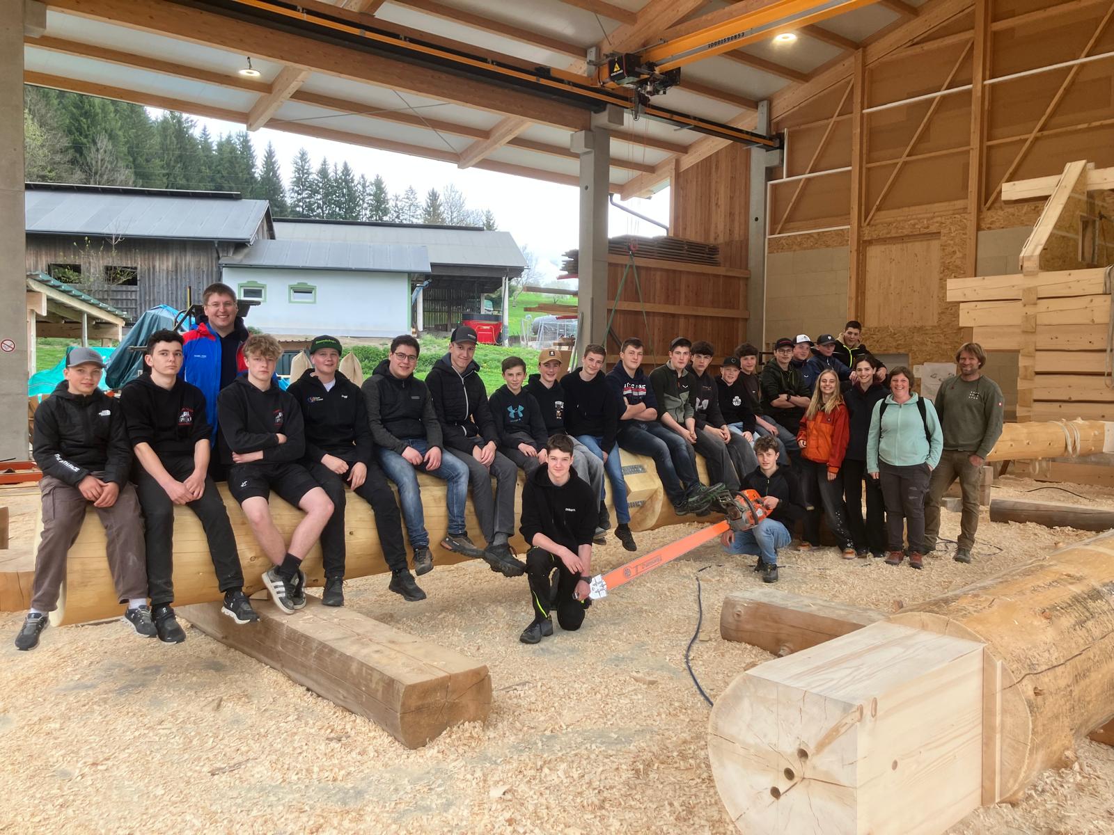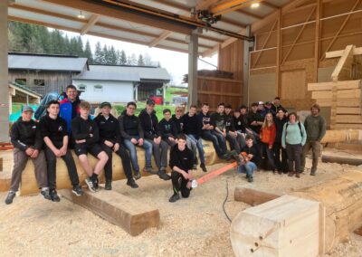 Den Abschluss der Exkursion bildete ein Besuch bei einem Betrieb für Rundholzhäuser. Dort wurde den Schüler:innen gezeigt, wie mit speziellen Werkzeugen – darunter eine Motorsäge mit einem bis zu zwei Meter langen Schwert – gearbeitet wird. Der Betrieb hat bereits rund 100 Rundholzhäuser errichtet, unter anderem auch in Dresden und Hannover. Das verwendete Holz, hauptsächlich Fichte und Tanne, stammt überwiegend aus Kärnten. Der Familienbetrieb wird heute erfolgreich in zweiter Generation geführt.