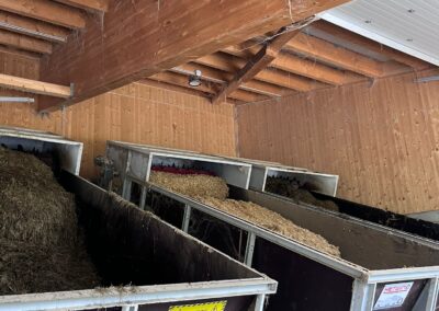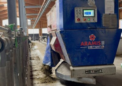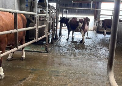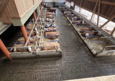 Die Tiere werden in einem Laufstall mit Tiefboxen gehalten und nach Leistung in Gruppen eingeteilt. Automatisierte Systeme wie Futter- und Ausmistroboter sorgen für Effizienz und erleichtern die tägliche Arbeit erheblich.
